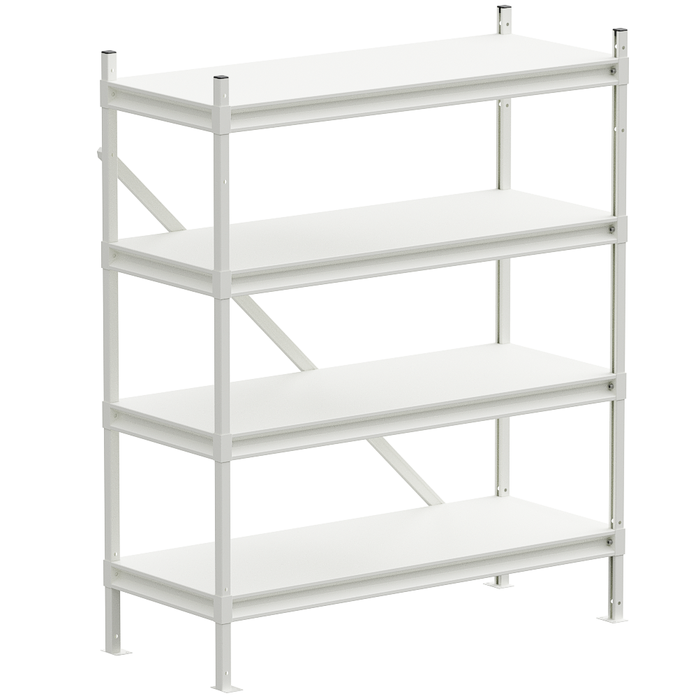 Стеллаж металлический усиленный с плавно регулируемыми по высоте полками. Не требует дополнительного выравнивания полов для установки. В стандартной комплектации стеллаж имеет 4 полки.